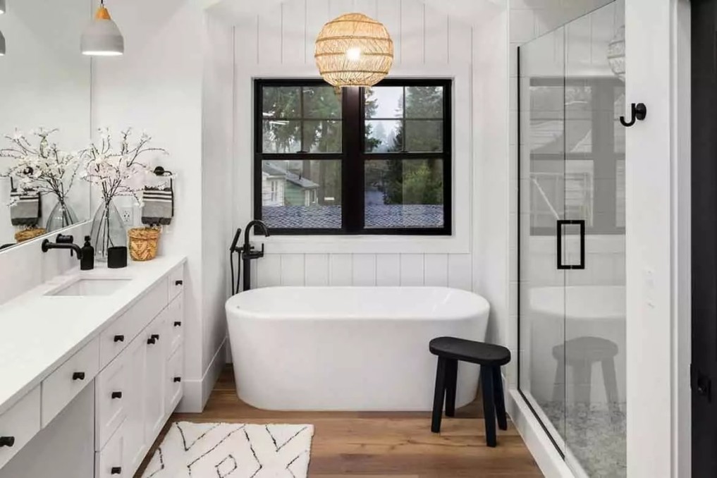 O lustră originală, o veioză sau un lanț cu lumini, nu doar că extind vizual spațiul, dar și decorează frumos baia.