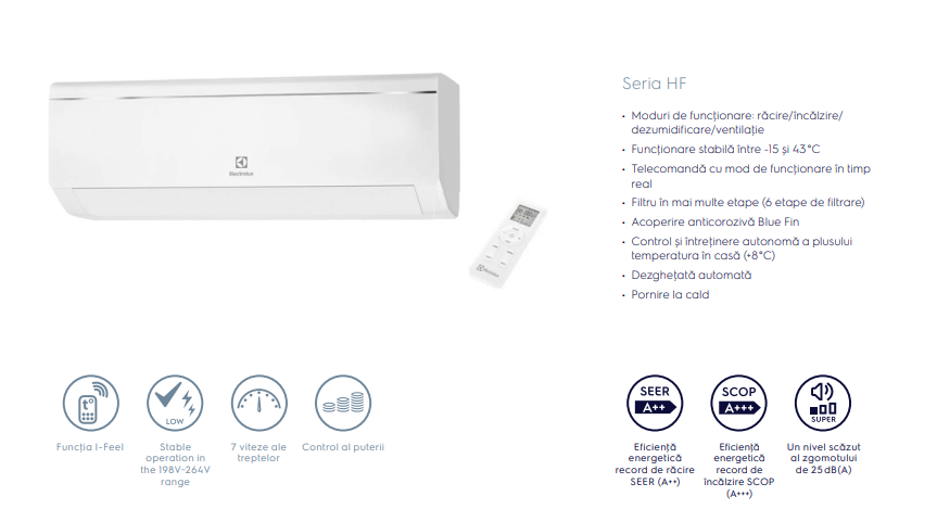 Aer conditionat Electrolux , 9000BTU, Clasa A++/A+++, Inverter, Functia I-FEEL , model HF, zgomot redus